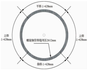 b.螺旋鋼管運至現場安裝焊接連接施工,焊接方法有平焊、立焊、仰焊,其中仰焊焊縫質量控制難度大。